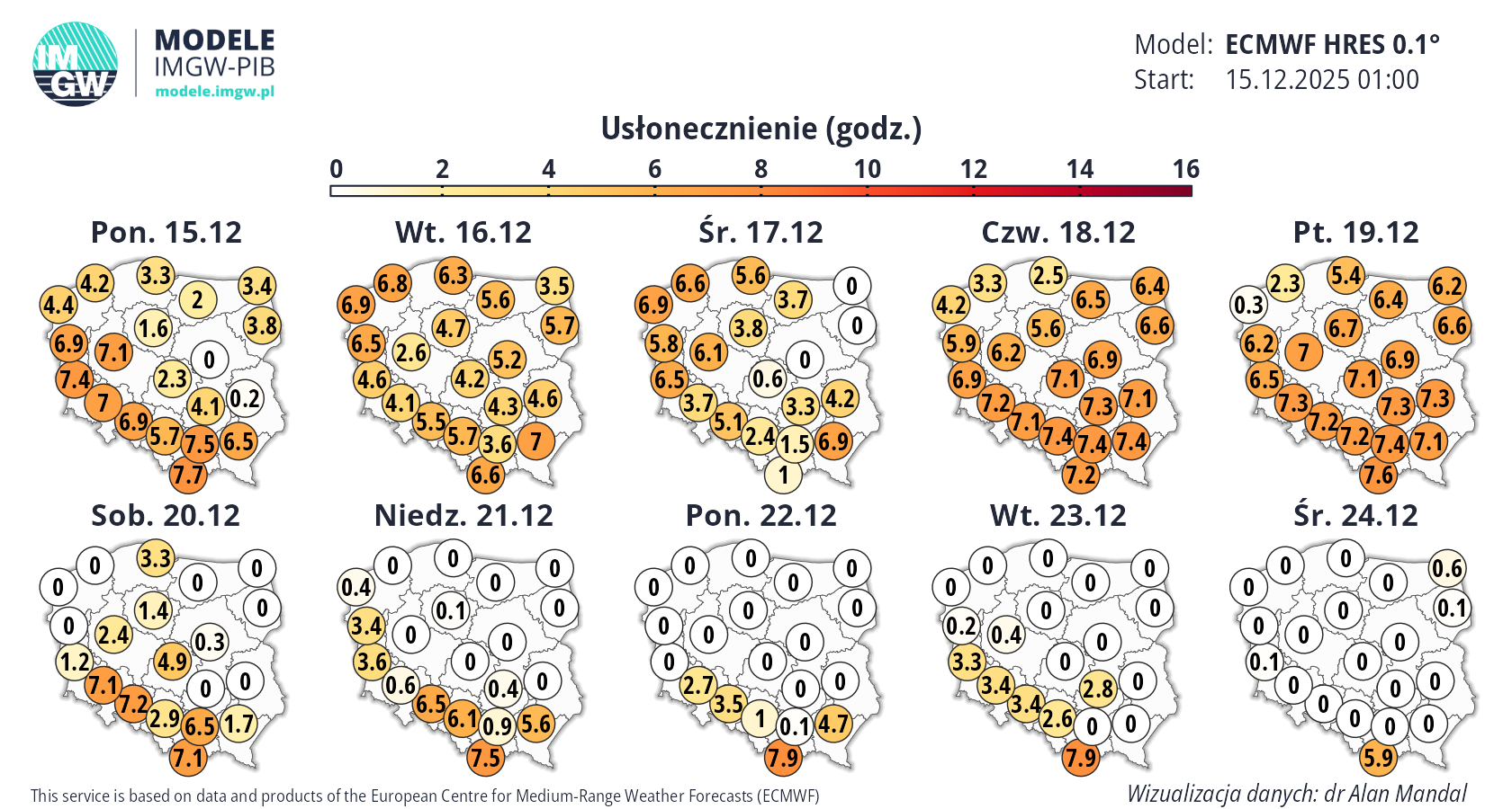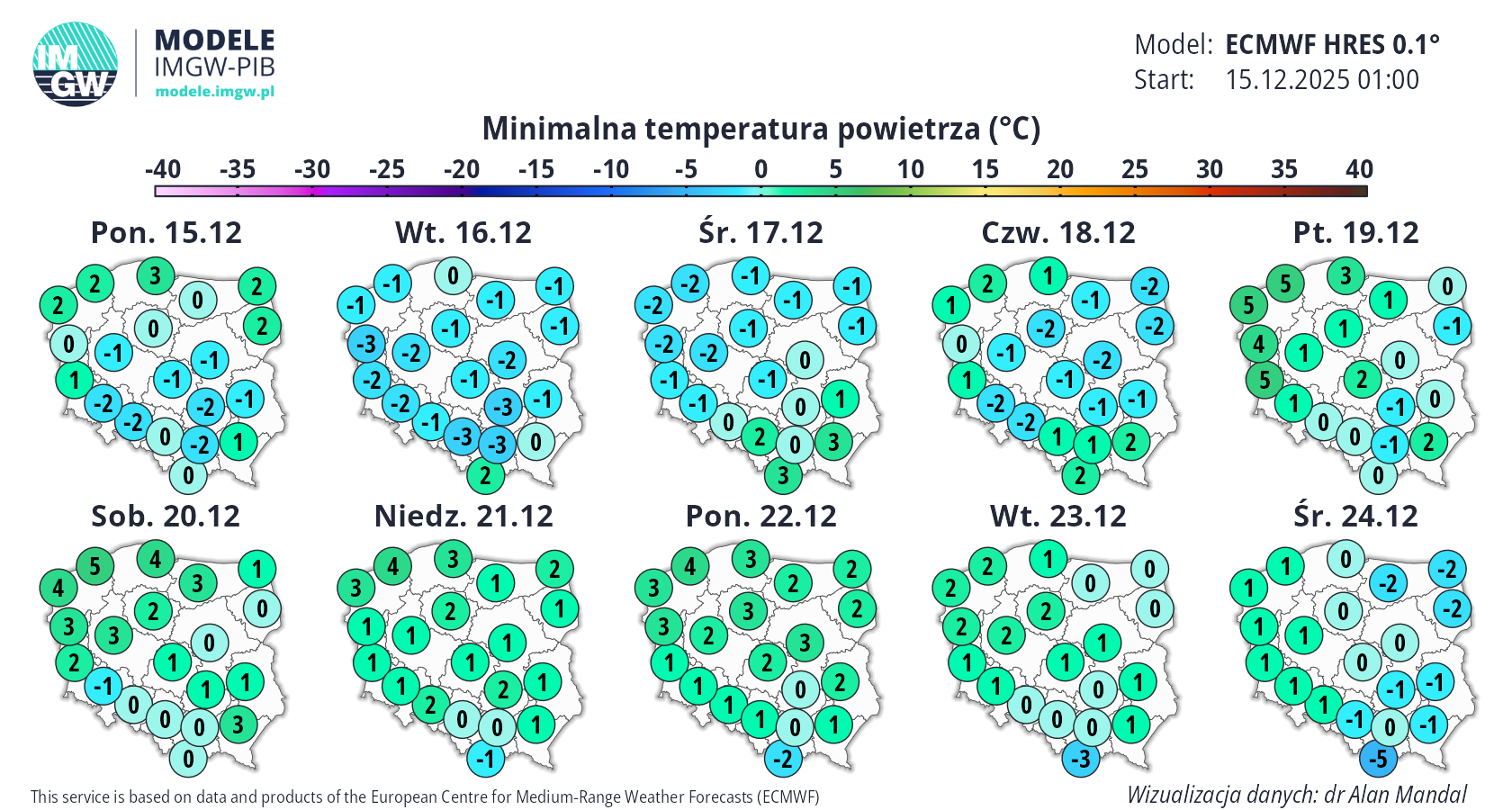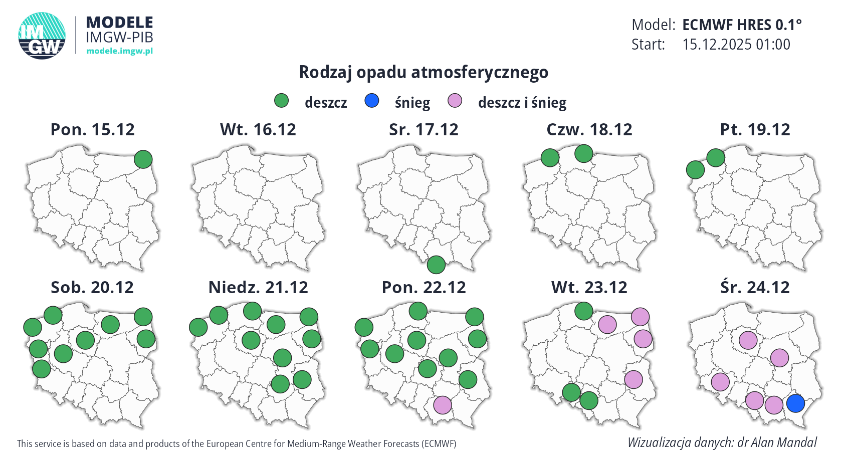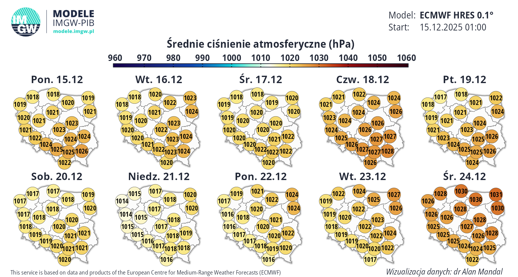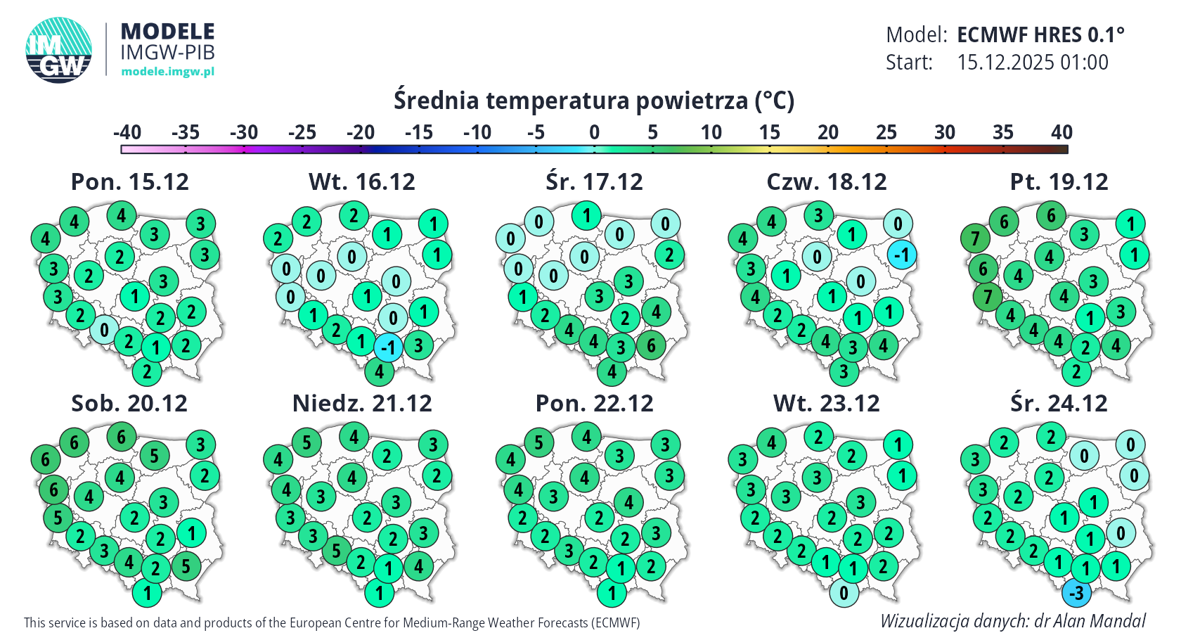 Prognoza średnioterminowa jest publikowana na podstawie wyników predykcji numerycznego modelu pogody ECMWF HRES 0.1°. Wyniki prezentowane na mapach podlegają codziennej aktualizacji. Prawdopodobieństwo wystąpienia wskazanych wartości może ulec zmianom, zwłaszcza w przypadku terminów odległych od terminu startu modelu (> 7 dni). Więcej o modelu ECMWF HRES (czytaj dalej).