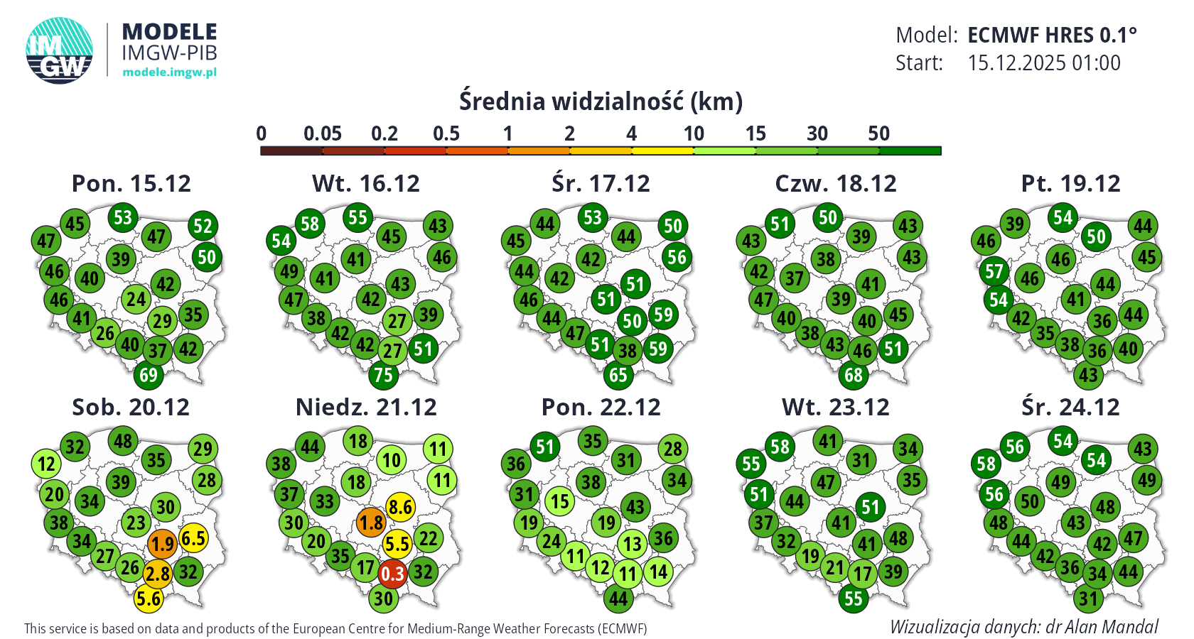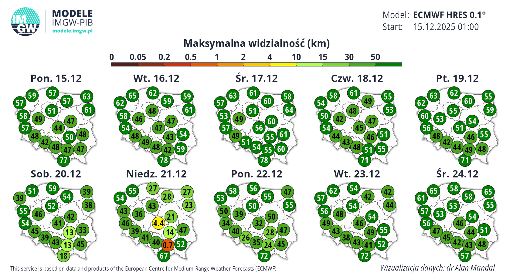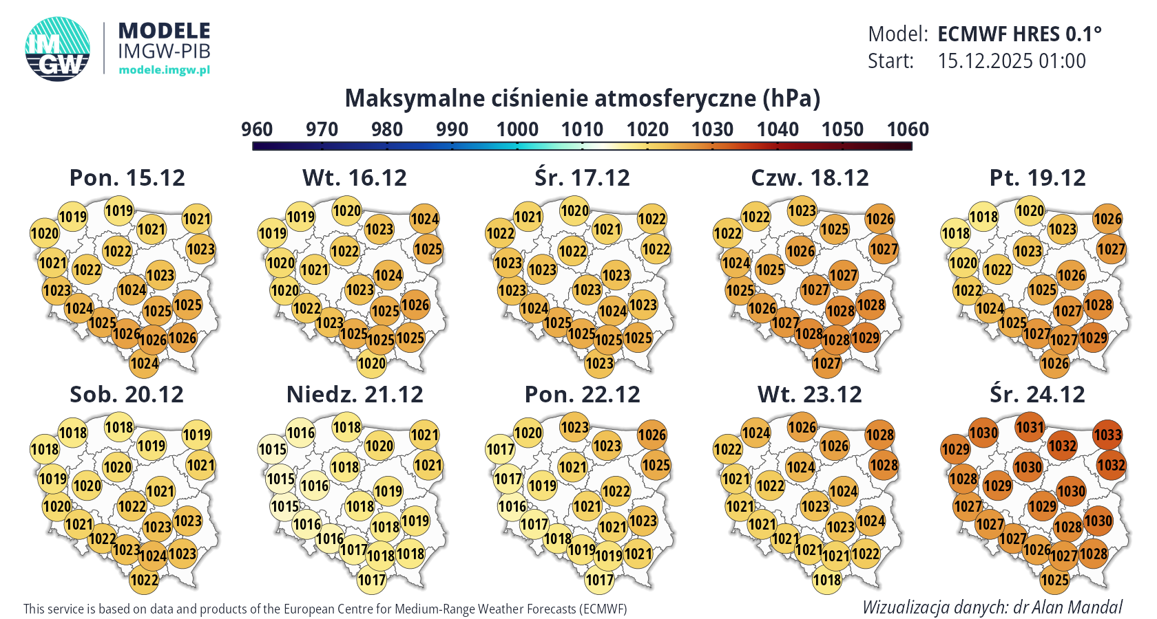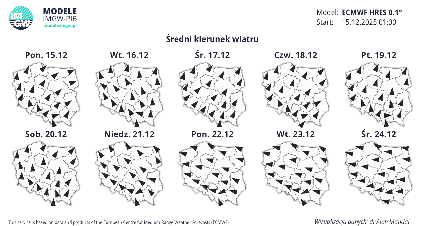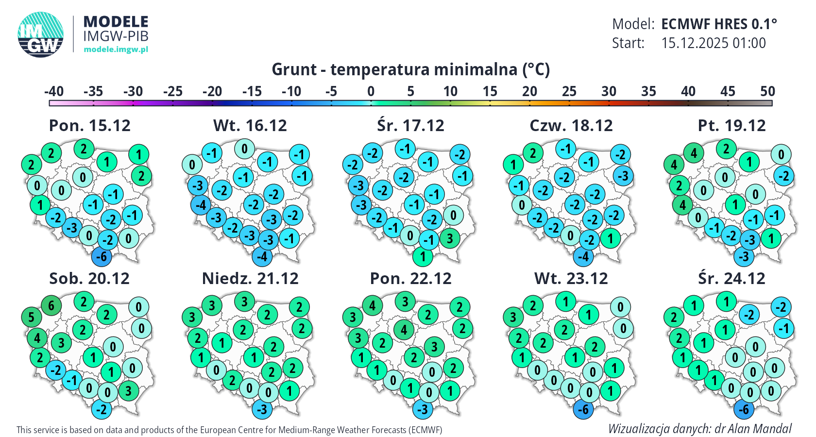 Prognoza średnioterminowa jest publikowana na podstawie wyników predykcji numerycznego modelu pogody ECMWF HRES 0.1°. Wyniki prezentowane na mapach podlegają codziennej aktualizacji. Prawdopodobieństwo wystąpienia wskazanych wartości może ulec zmianom, zwłaszcza w przypadku terminów odległych od terminu startu modelu (> 7 dni). Więcej o modelu ECMWF HRES (czytaj dalej).