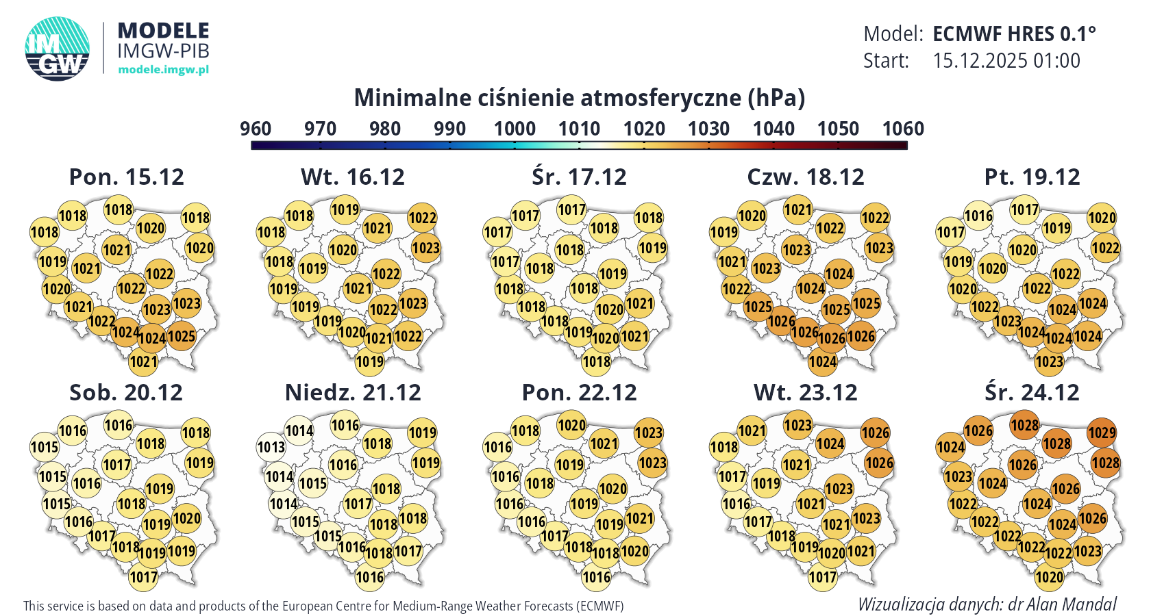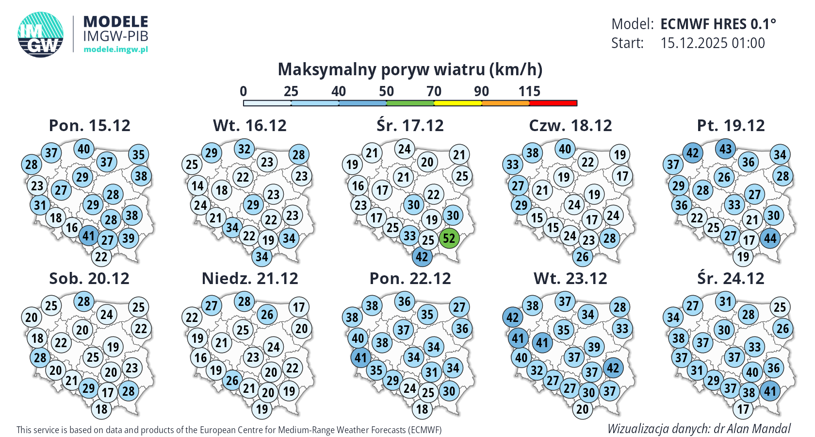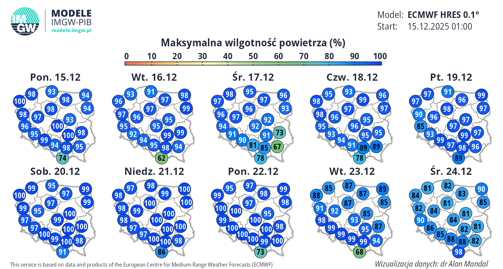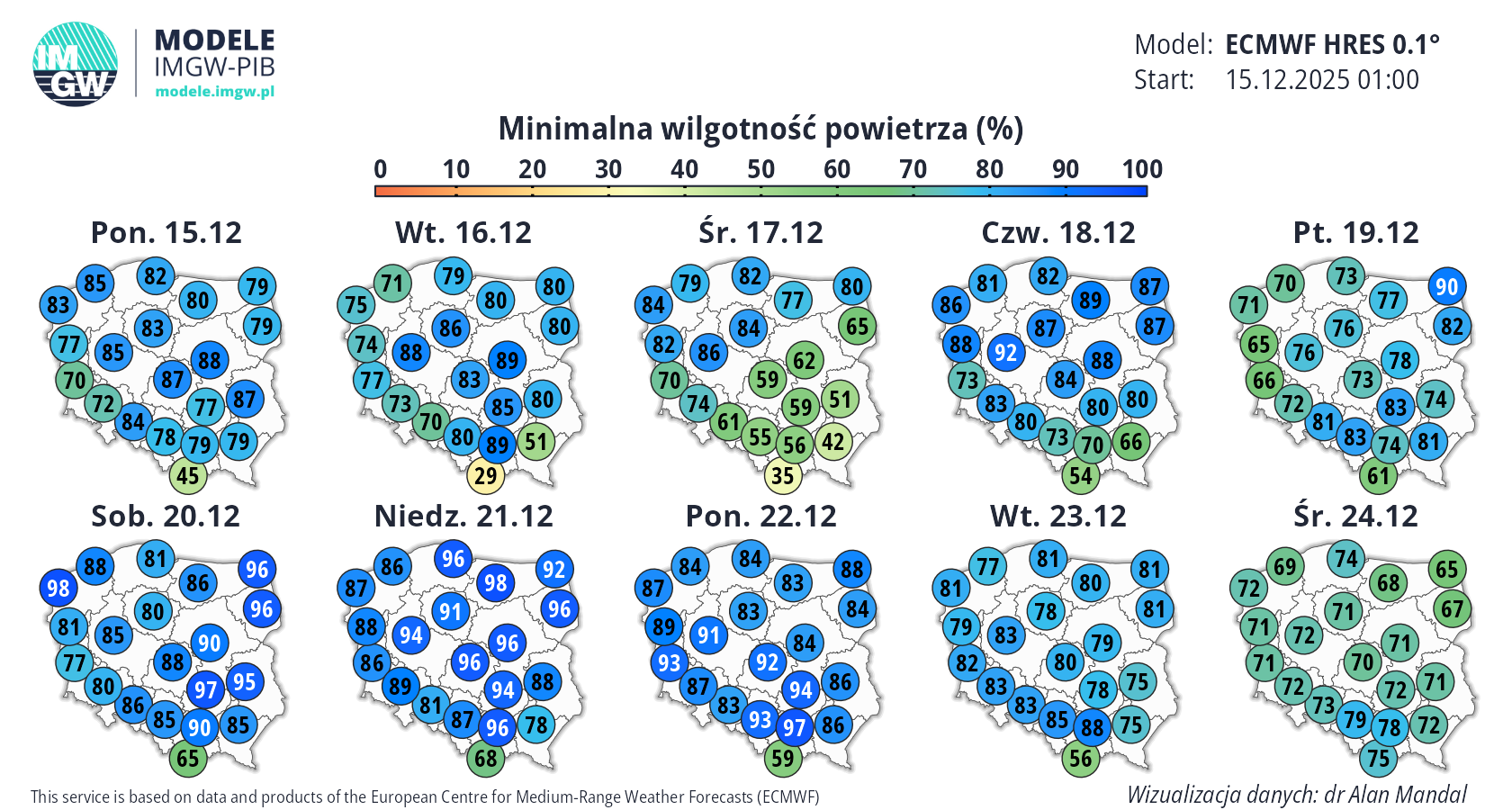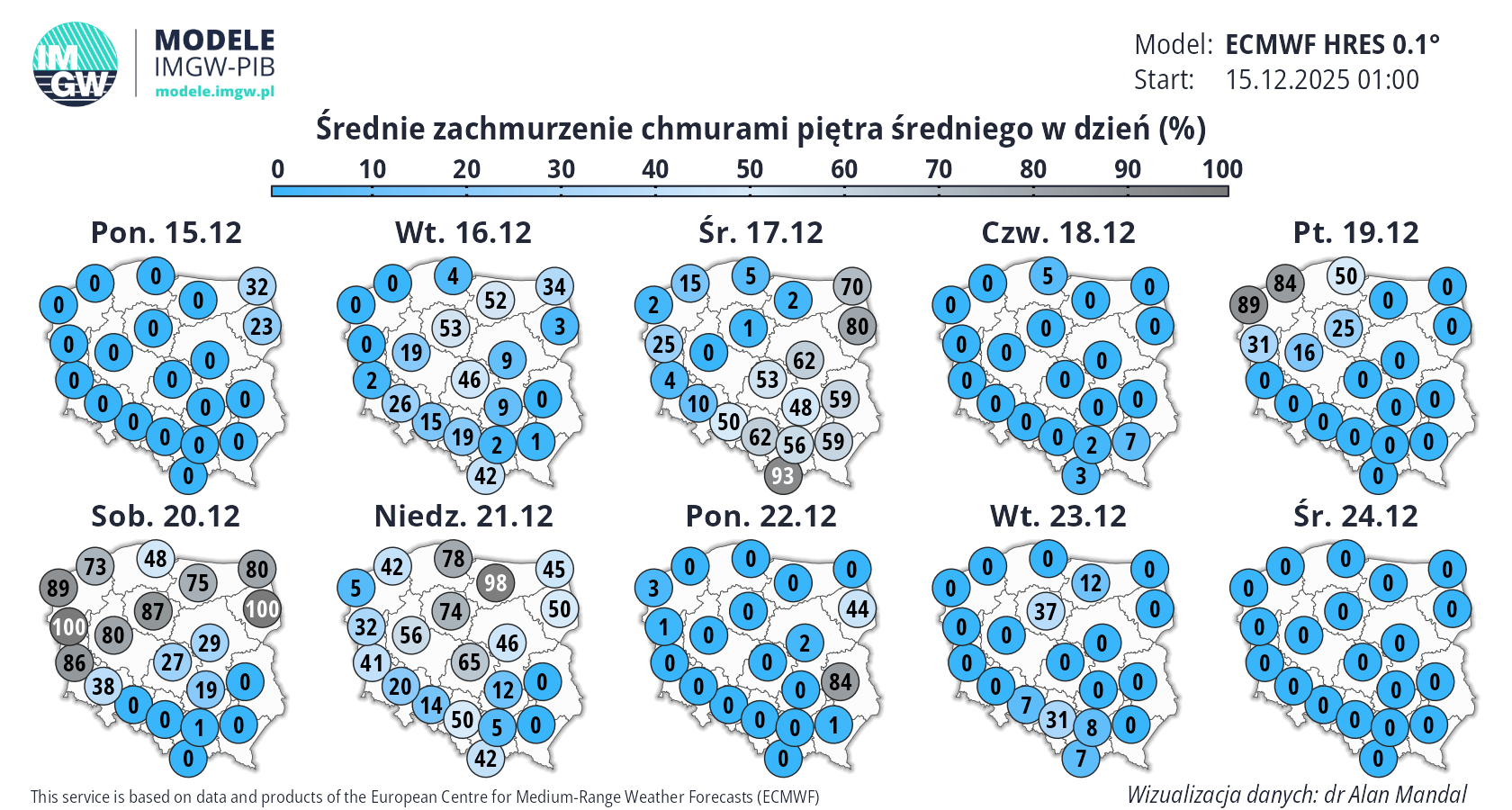 Prognoza średnioterminowa jest publikowana na podstawie wyników predykcji numerycznego modelu pogody ECMWF HRES 0.1°. Wyniki prezentowane na mapach podlegają codziennej aktualizacji. Prawdopodobieństwo wystąpienia wskazanych wartości może ulec zmianom, zwłaszcza w przypadku terminów odległych od terminu startu modelu (> 7 dni). Więcej o modelu ECMWF HRES (czytaj dalej).